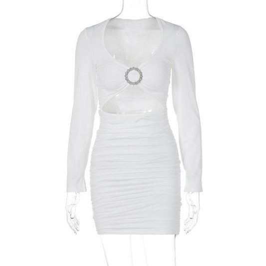 Style: SexyFit: SlimFabric: PolyesterPattern: SolidElement: Cutout,Ruched,RhinestoneNeckline: V-NeckSleeve Type: RegularSleeve Length: Long SleeveProduct Type: Bodycon Dress,Cutout DressOccasion: Party & ClubDress/Skirt Length: ShortMain Composition: PolyesterSeason: Spring/Fall- $29.88