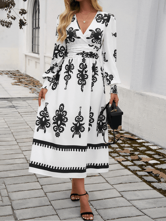 Women's Printed V-Neck Sexy Slit Long Sleeve Dress