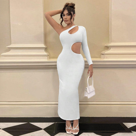 One Shoulder Diagonal Collar Long Sleeve Cutout Maxi Dress