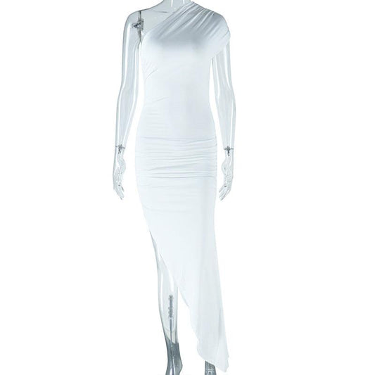 Style: SexyFit: SlimFabric: PolyesterPattern: SolidElement: Split,Ruched,AsymmetricNeckline: One ShoulderSleeve Type: OthersSleeve Length: SleevelessProduct Type: Bodycon Dress,Maxi Dress,Asymmetrical Dress,Split DressOccasion: Party & ClubDress/Skirt Length: MaxiMain Composition: PolyesterSeason: Summer- $27.69