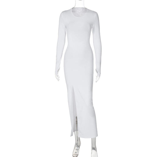 Style: SexyFit: SlimFabric: PolyesterPattern: SolidElement: Split,CutoutNeckline: Crew NeckSleeve Type: RegularSleeve Length: Long SleeveProduct Type: Split Dress,Maxi Dress,Cutout Dress,Bodycon DressOccasion: Party & ClubDress/Skirt Length: MaxiMain Composition: PolyesterSeason: Spring/Fall- $29.00