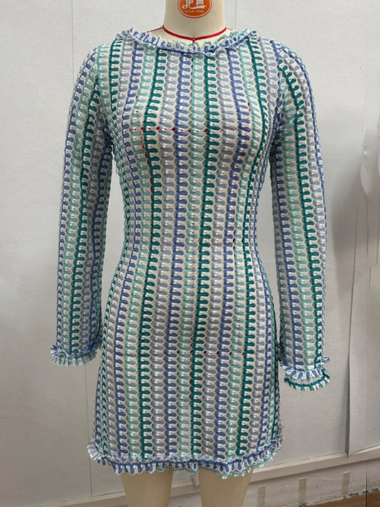 Women's New Fashion Solid Color Slim Fit Pleated Round Neck Long Sleeve Dress