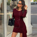 Slim Fit Pleated Waist Tight Ribbon Solid Color Long Sleeve Dress