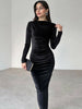 Women's New Fashion Solid Color Slim Fit Pleated Round Neck Long Sleeve Dress